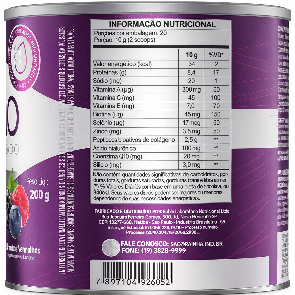 Colágeno Hidrolisado, Peptídeos Bioativo de Colágeno Hidrolisado com peso molecular média 2kDa®, Ácido Hialurônico (Hialuronato de Sódio), Coenzima Q10, Silício (Cloreto de Colina), Vitamina C (Ácido Ascórbico), Vitamina E (DL Alfa Acetato de Tocoferol), Zinco (Sulfato de Zinco Monohidratado), Vitamina A (Acetato de Retinol), Biotina (D-Biotina), Selênio (Selenito de Sódio), Antiumectante Dióxido de Silício, Aroma idêntico ao Natural de Abacaxi com Hortelã, Acidulante Ácido Cítrico, Edulcorante Glicosídeo Steviól (Stévia rebaudiana). NÃO CONTÉM GLÚTEN. ALÉRGICOS: PODE CONTER DERIVADO DO LEITE.
