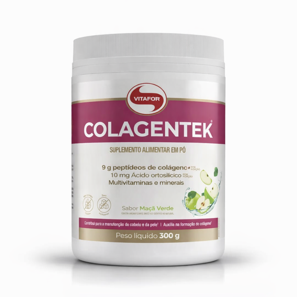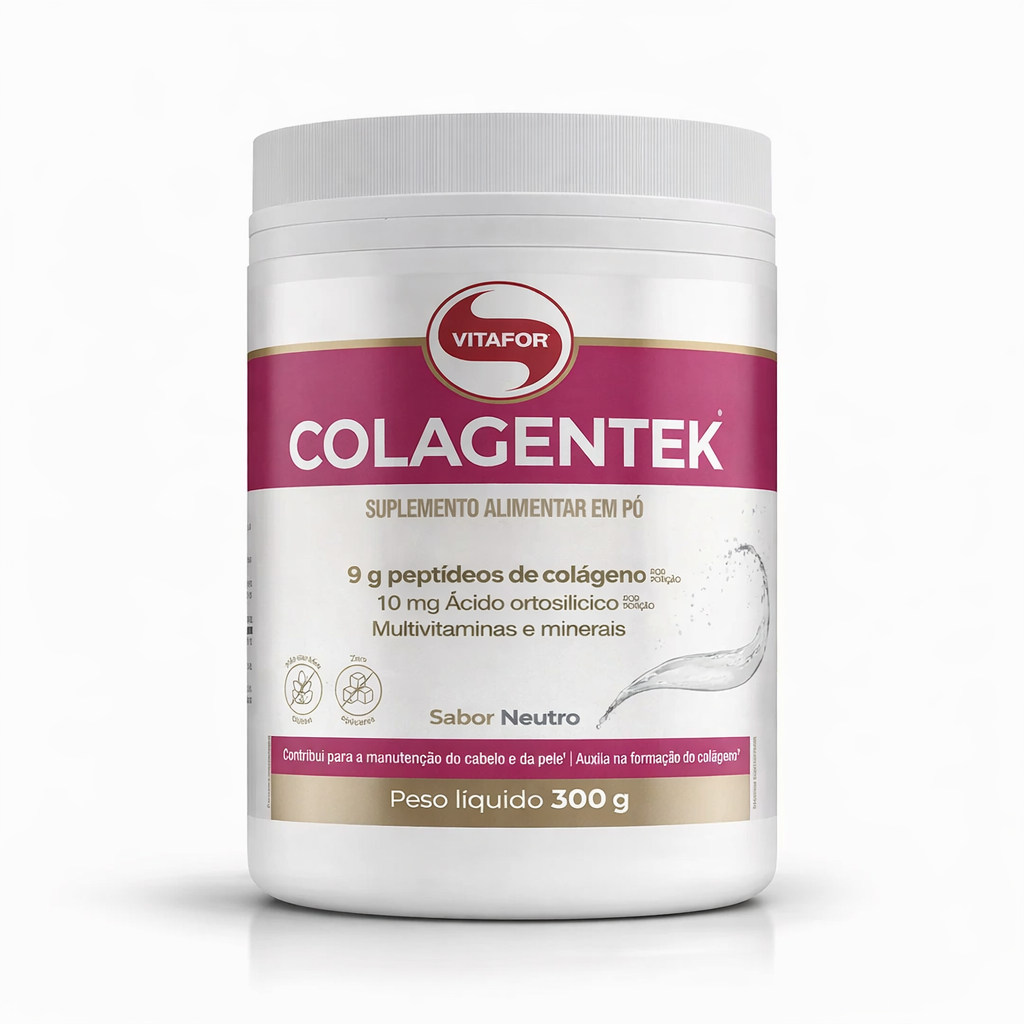 Colagentek, da Vitafor, possui uma formulação pensada para a saúde da sua pele, dos cabelos e das unhas. Além de peptídeos de colágeno, conta ácido ortosilícico, que pode estimular a produção de colágeno; ácido hialurônico; biotina e diversas vitaminas, como C, A, E, D, B6 e B12, que auxiliam no funcionamento do sistema imune e, na proteção dos danos causados pelos radicais livres⁴’⁵.