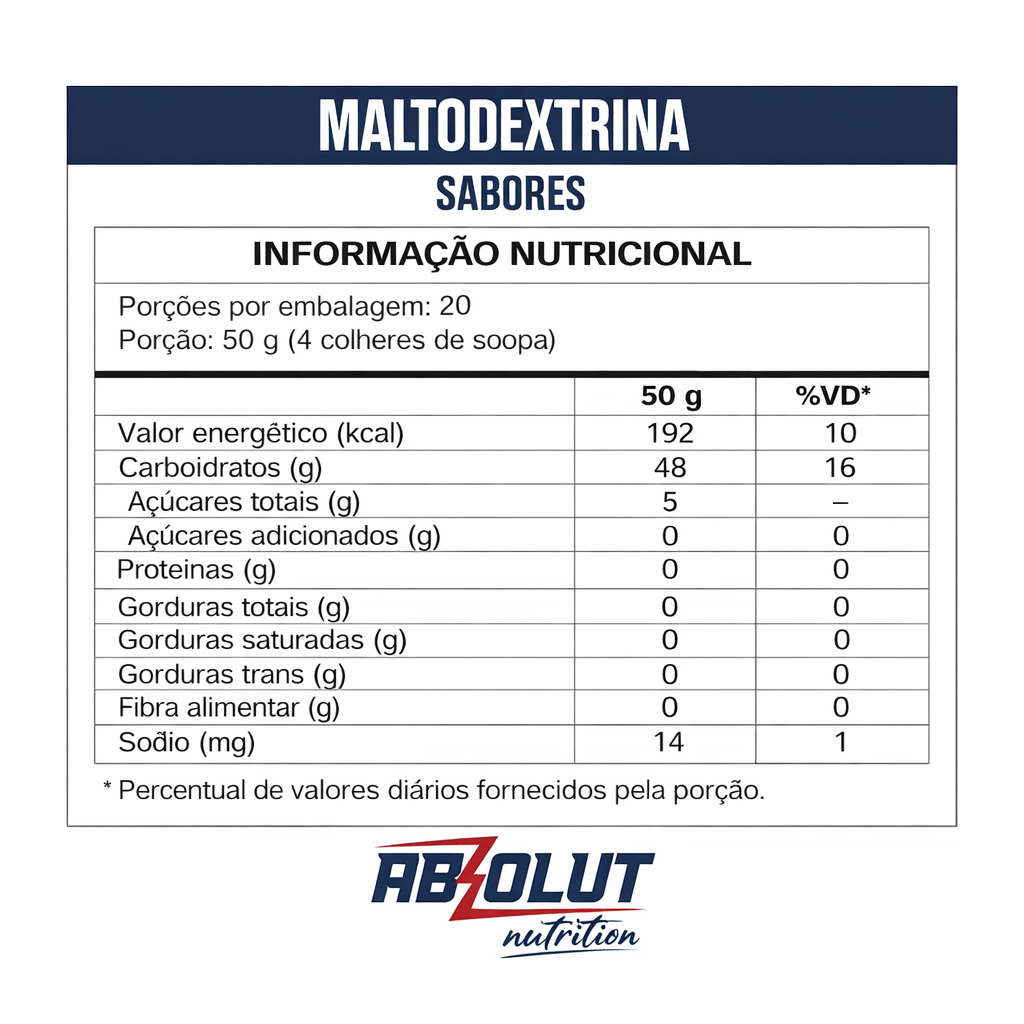 A Maltodextrina Absolut Nutrition, é um carboidrato complexo. Tem uma absorção mais gradativa pelo organismo. Os carboidratos presentes na Malto são metabolizados de forma mais lenta pelo corpo humano, contribuindo para um aumento de insulina na corrente sanguínea. Assim ele aumenta o índice de glicose nas células ajudando a evitar o catabolismo durante treinos mais intensos.