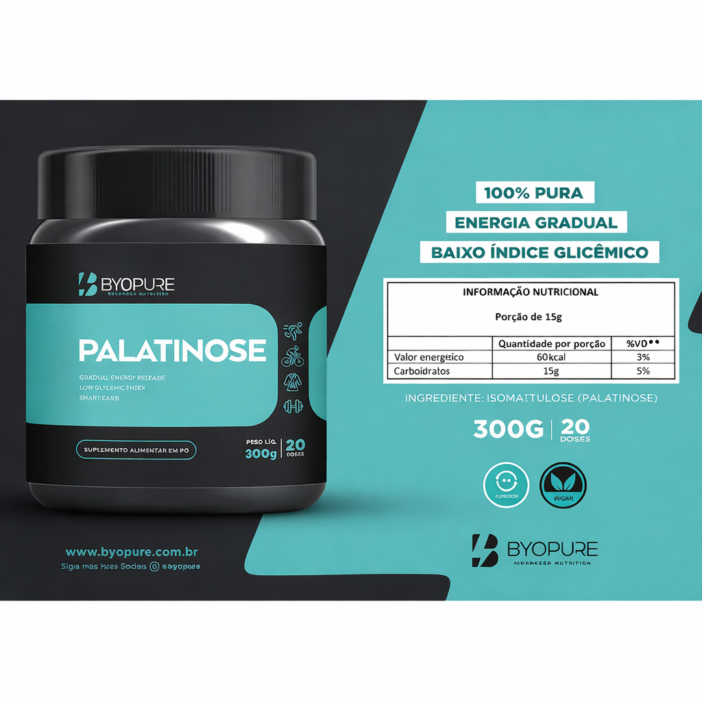 PALATINOSE BYOPURE 300G - 40 DOSES A palatinose é um carboidrato de baixo índice glicêmico, que proporciona energia gradual e sustentada ao organismo. É utilizada como substituto do açúcar em algumas bebidas e alimentos, tornando-se popular entre pessoas que buscam uma alimentação com menor impacto no nível de açúcar no sangue. Ingredientes: Palatinose.