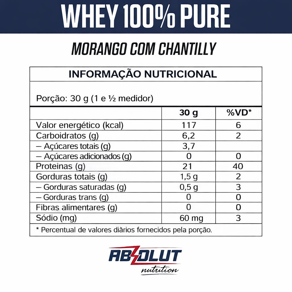 O Whey 100% pure da Absolut Nutrition é uma proteína de alta qualidade ideal para quem busca ganho de massa muscular e recuperação rápida após os treinos, além de ser um excelente aliado para quem precisa bater a meta diária de proteína. Ele fornece todos os aminoácidos essenciais para o corpo, ajudando no crescimento e na manutenção dos músculos. Adoçado com stevia, um adoçante 100% natural, possui uma saborização excepcional, o que faz do nosso Whey o mais procurado do mercado.