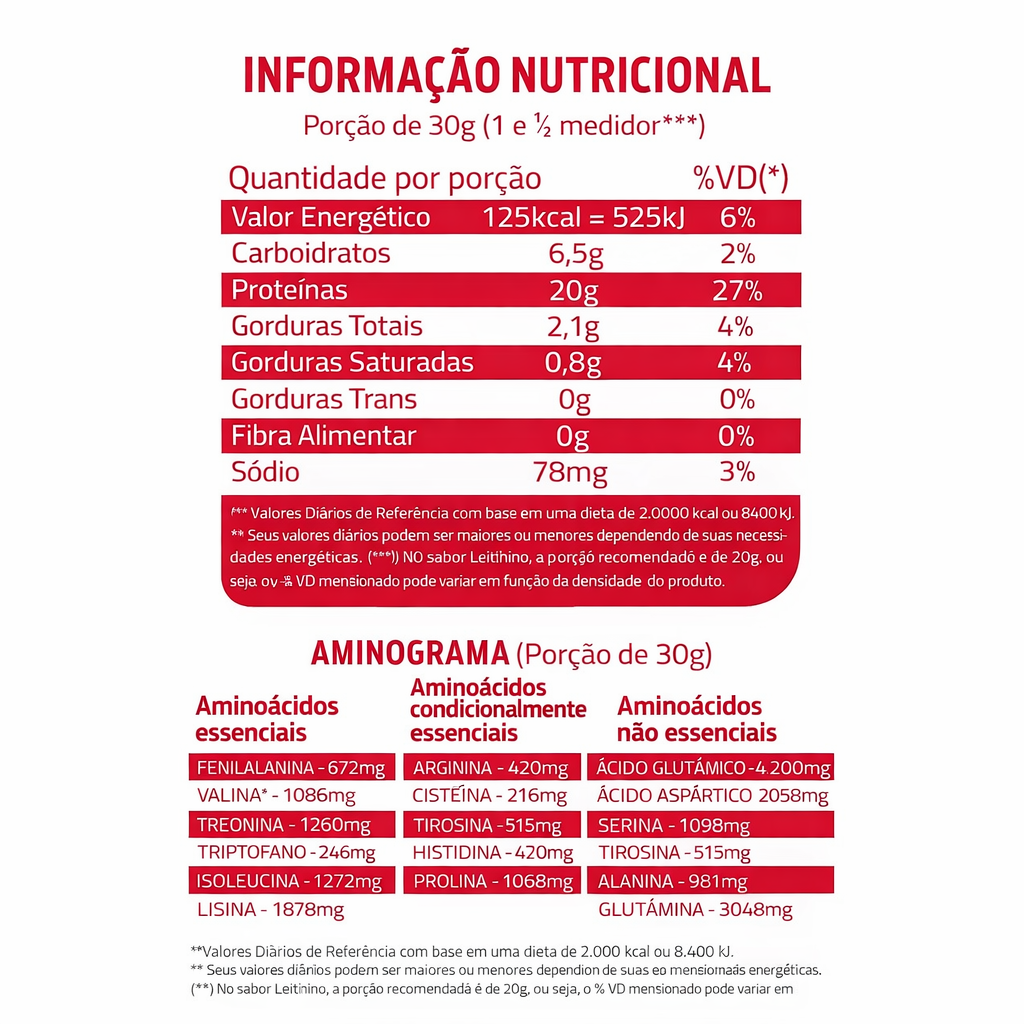 Ingredientes: Proteína concentrada do soro de leite, leite desnatado em pó, aromatizante