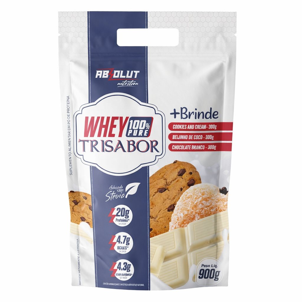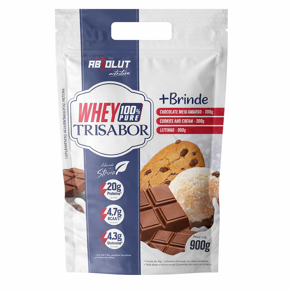 O Whey 100% Concentrado Trisabor é a escolha perfeita para quem busca sair da mesmice de um único sabor, ou conhecer novos sabores. O pouch de 900g vem com três embalagens individuais de 300g com três sabores diferentes. O Whey da Absolut Nutrition é uma proteína de alta qualidade ideal para quem busca ganho de massa muscular e recuperação rápida após os treinos, além de ser um excelente aliado para quem precisa bater a meta diária de proteína. Ele fornece todos os aminoácidos essenciais para o corpo, ajudando no crescimento e na manutenção dos músculos. Adoçado com stevia, um adoçante 100% natural, possui uma saborização excepcional, o que faz do nosso Whey o mais procurado do mercado.